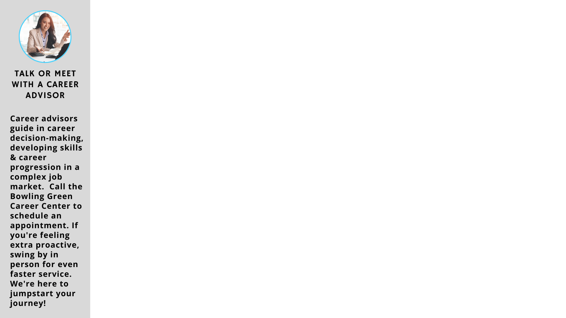 You have options! You can wait for a call from one of our dedicated Career Advisors (within two business days), or you can dive right into the action. Take the initiative by giving a call to the Bowling Green Career Center to schedule an appointment. If you're feeling extra proactive, swing by in person for even faster service. We're here to jumpstart your journey!