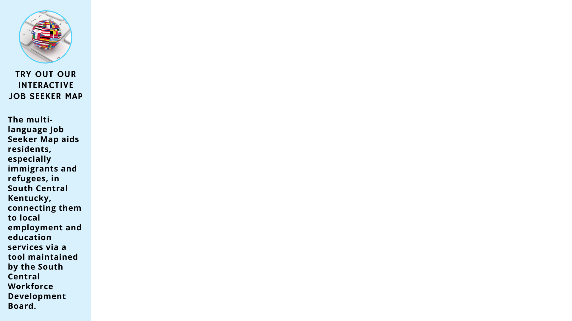 The Job Seeker Map is a tool that provides information about resources, programs and agencies who help job seekers. This tool was created to help all residents who live in South Central Kentucky, but it is intended to help immigrants and refugees of all ages who speak different languages connect to employment and education professionals at local programs and services. This guide is maintained by the South Central Workforce Development Board.
