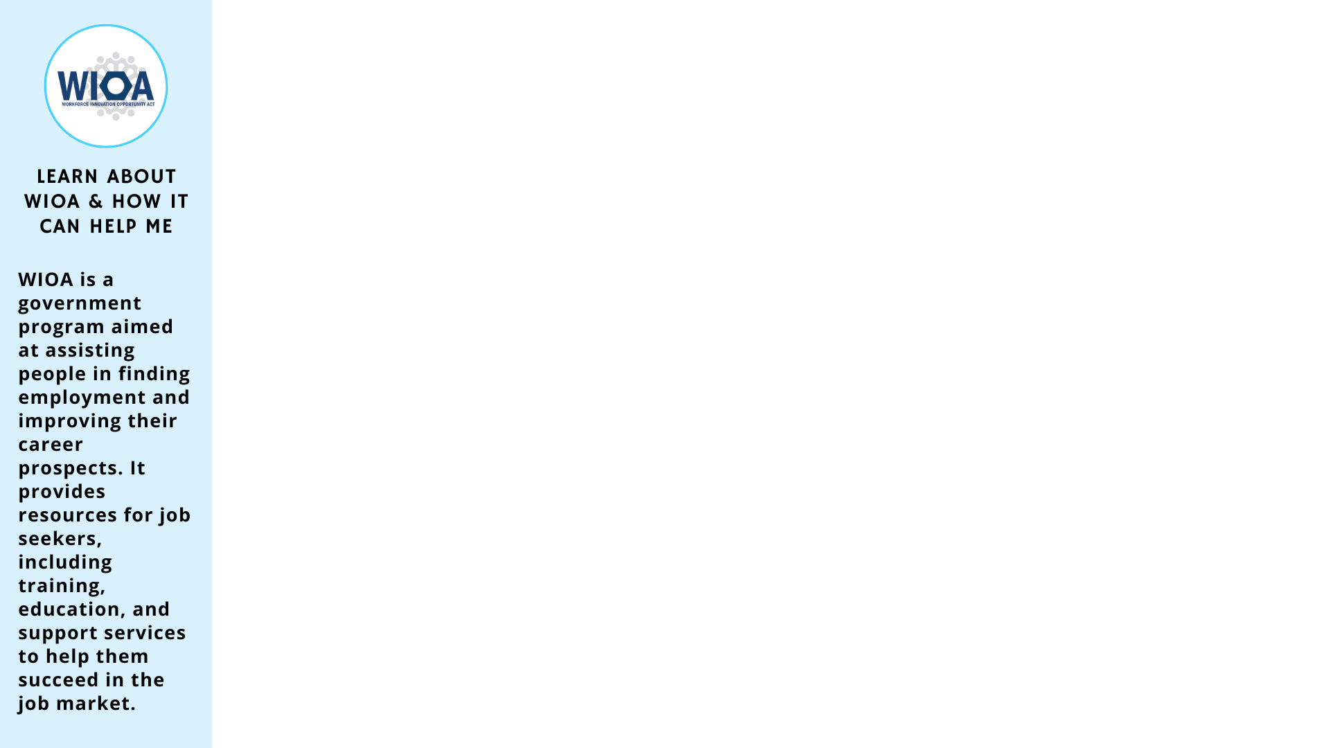 The Workforce Innovation and Opportunity Act (WIOA) is designed to help job seekers access employment, education, training, and support services to succeed in the labor market and to match employers with the skilled workers they need to compete in the global economy.