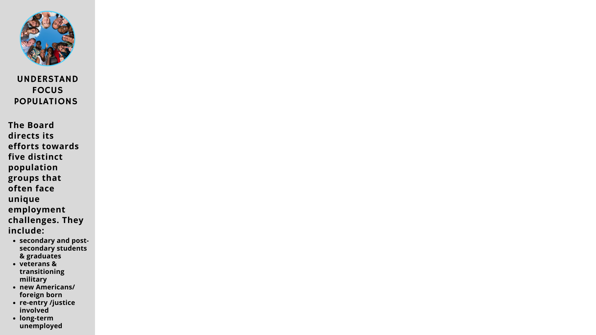 While these focus populations have been identified, it should be noted that the Board enthusiastically serves all job seekers regardless of their demographic.