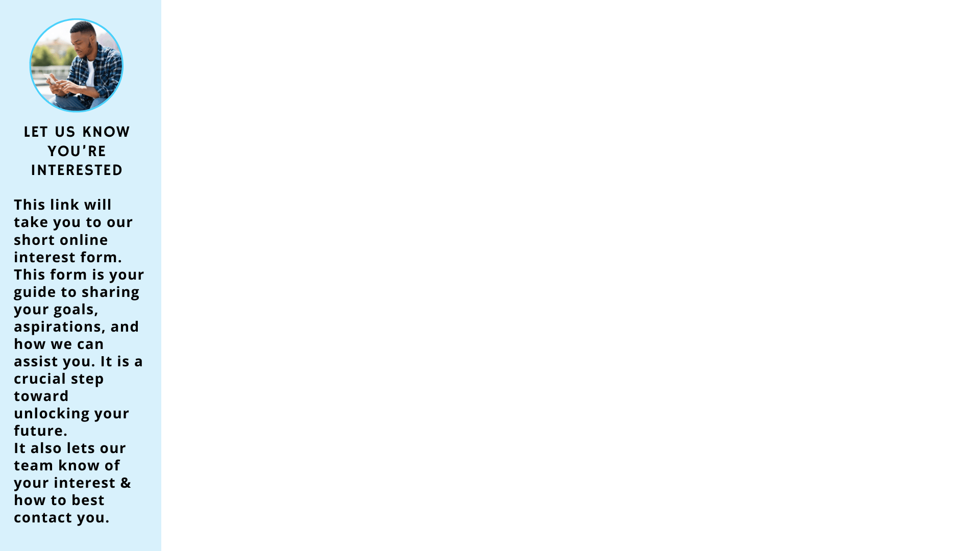 Let's kick off your journey with a quick and easy step – filling out our online interest form. This form is your golden ticket to letting us know your goals, your aspirations, and how we can best assist you. It's not just a form; it's your beacon, guiding our dedicated career advisors on the path to finding what's perfect for you. Plus, it's a breeze to complete, taking just 5 minutes or less. Trust us, it's a crucial key to unlock your future.